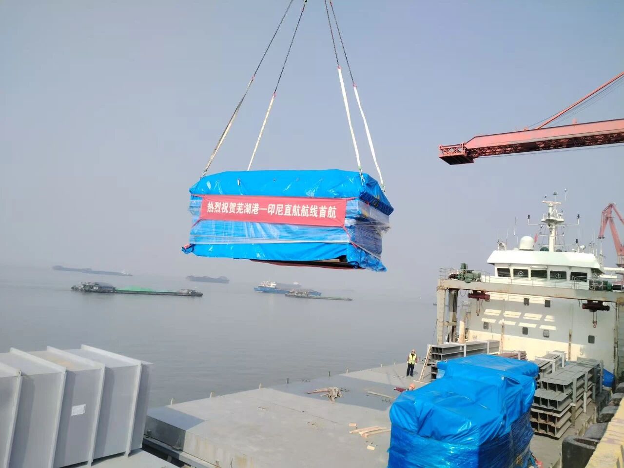 該輪近期從印尼格雷西港吉配碼頭出發,一路直航抵達蕪湖港。靠港後,港口高效完成約2000噸碎玻璃及88件大型設備的裝船綁紮作業,隨後該貨輪將直航返回印尼,真正實現“點對點”直航往返,大幅縮短物流週期、提升運輸效率。